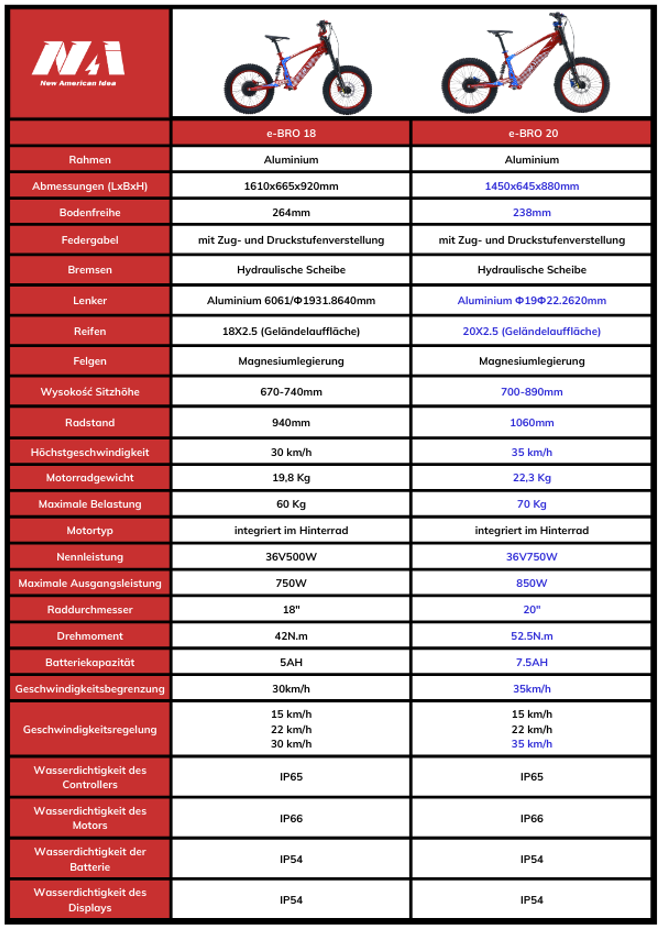 NAI e-BRO 20 erreicht eine höhere Höchstgeschwindigkeit (35 km/h vs. 30 km/h) und hat eine größere Batteriekapazität (7,5 Ah vs. 5 Ah), was zu einer längeren Reichweite führt (39 km vs. 25 km).