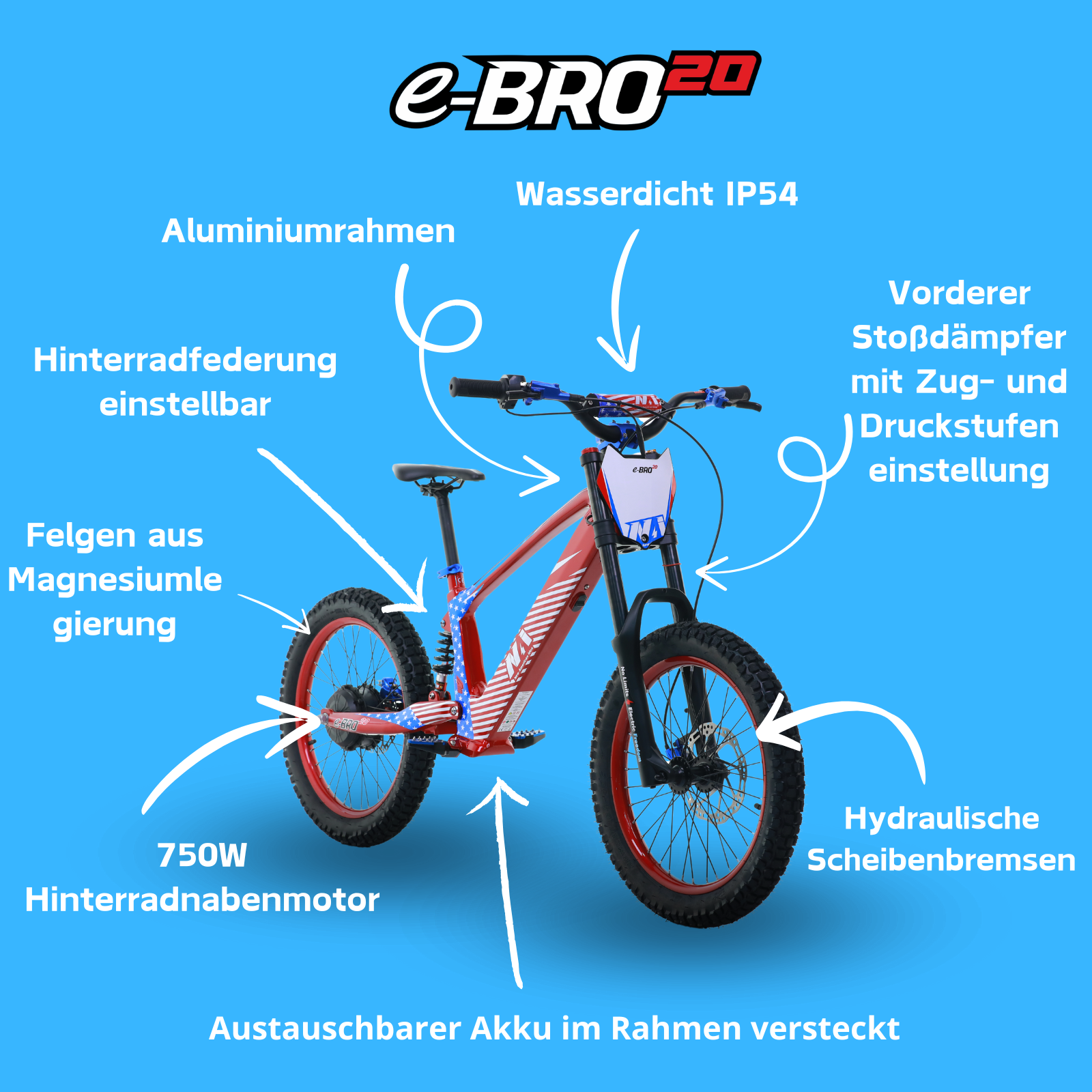 NAI e-BRO 20 ist die neueste Version unseres Flaggschiffprodukts e-BRO 18, entwickelt für größere Jugendliche. In dieser Version haben wir eine Reihe bedeutender Änderungen eingeführt – z. B. einen größeren Rahmen, eine verbesserte Federung und größere Räder – was ihn zur besten Wahl für größere Fahrer macht.
