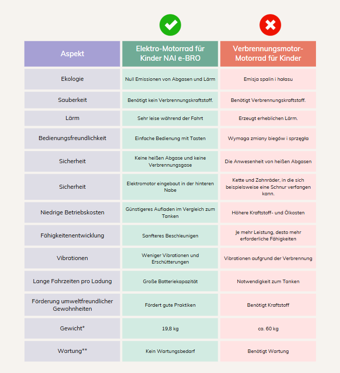 *Das Gewicht des Motorrads spielt eine entscheidende Rolle in Bezug auf die einfache Handhabung und Manövrierfähigkeit des Fahrzeugs – insbesondere bei jüngeren Nutzern wie Kindern. Es ist äußerst wichtig, dass das Motorrad den Fähigkeiten und der Kraft des Fahrers angemessen angepasst ist, da dies die Sicherheit und den Fahrkomfort maßgeblich beeinflusst.
